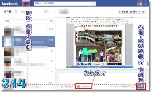 開啟 臉書→訊息→加新照片→回覆-將問題圖片 傳給我