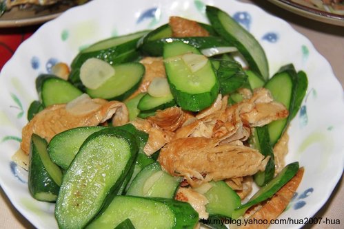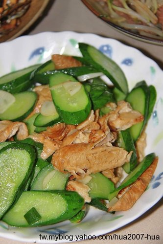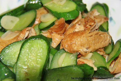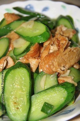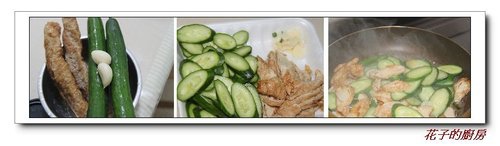 3.再加上豆皮卷片及小黃瓜,水100cc蓋上鍋蓋悶約1分鐘。